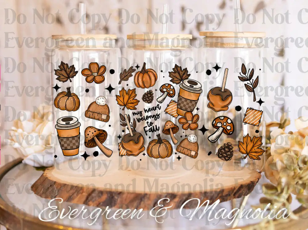 Celebrate the beauty of the season with our Fall UVDTF cup wrap, filled with cozy autumn vibes! This wrap features pumpkins, fall leaves, caramel apples, mushrooms, pinecones, cozy hats, and coffee cups, with the phrase “My heart belongs to Fall” at the center. Perfect for anyone who loves sweater weather, pumpkin spice, and crisp autumn days!